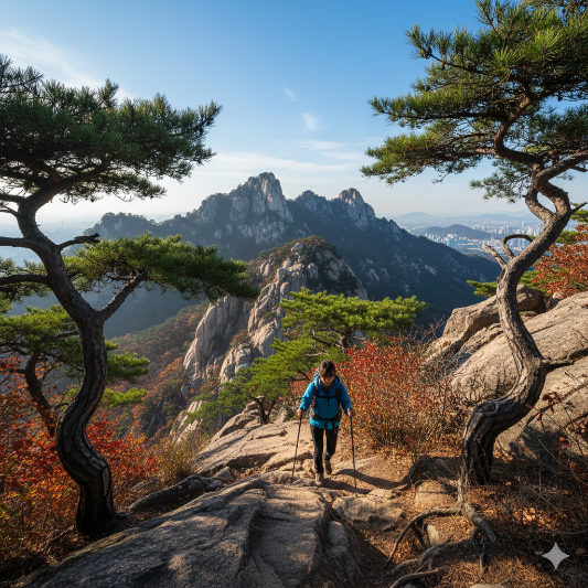 가장 인기 있는 코스로 왕복 약 3~4시간이 소요됩니다. 정상 부근의 웅장한 바위 능선을 타고 서울 시내를 한눈에 내려다볼 수 있는 백미 코스입니다.